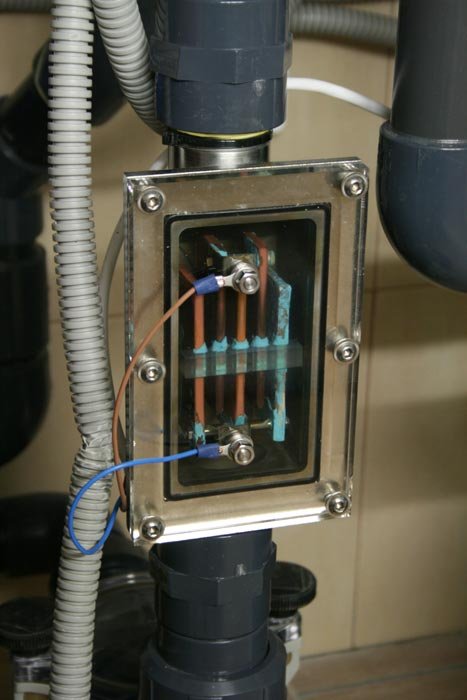 Silver ionizer is installed after the reverse osmosis system in the additional feeding line and is designed for the preservation of water by ions of dissolved silver, increasing its resistance to bacterial contamination. Silver ions effectively prevent the "blooming" of water in the swimming pool, obtaining of musty smell and taste, formation of slime (biofilm) on the swimming pool walls. Silver ionizer is activated / deactivated automatically depending on the water flow.